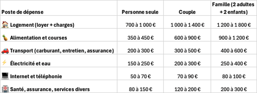 👨👩👧👦 Pour une famille, le budget mensuel se situe souvent entre 800 et 1 200 €, selon le nombre de personnes, les habitudes alimentaires et la part de produits importés. (Source : Aller-Vivre)